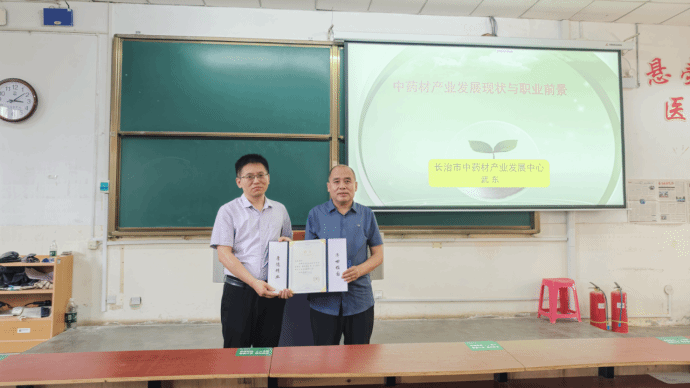 活动期间,药学院院长贺艳斌为武东主任颁发了长治医学院客座教授聘书。随后武东针对中国中药材产业发展、山西省以及长治市中药材产业发展现状、大健康产业以及中医药专业的发展前景展进行讲座。讲座过程中,武东以自身经历为切入,结合以往工作经验,对长治市的中药材基础以及前景进行了深入讲解,并对目前的发展现状进行了剖析。